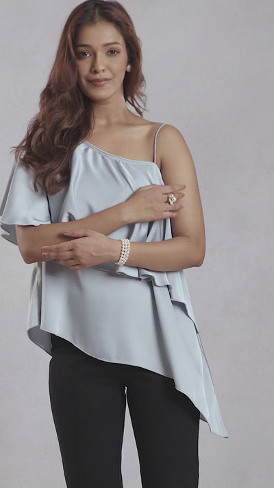 A study in modern grace. The Hailey top captivates with its fluid, asymmetrical drape and luxurious double satin feel, designed for unforgettable evenings.