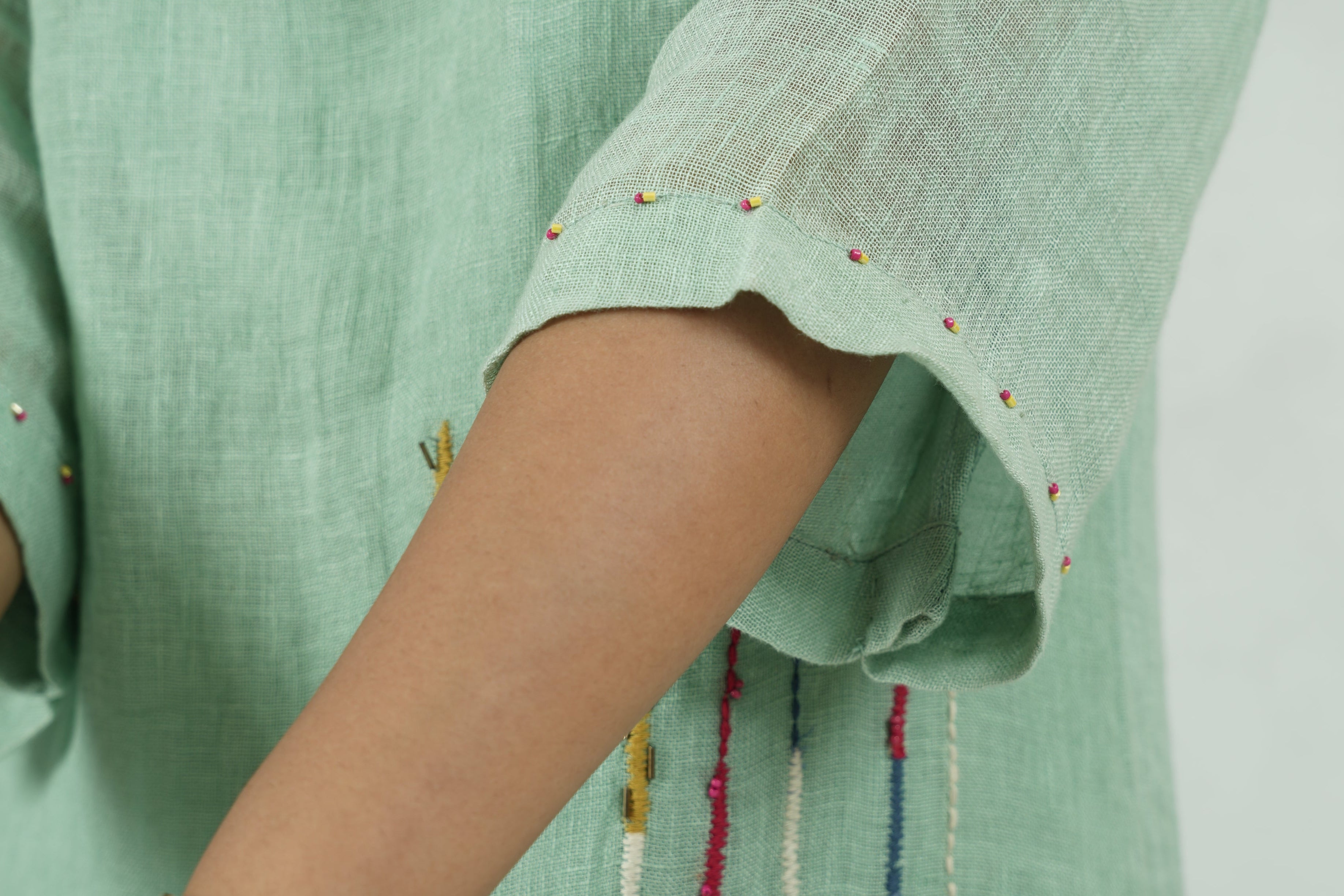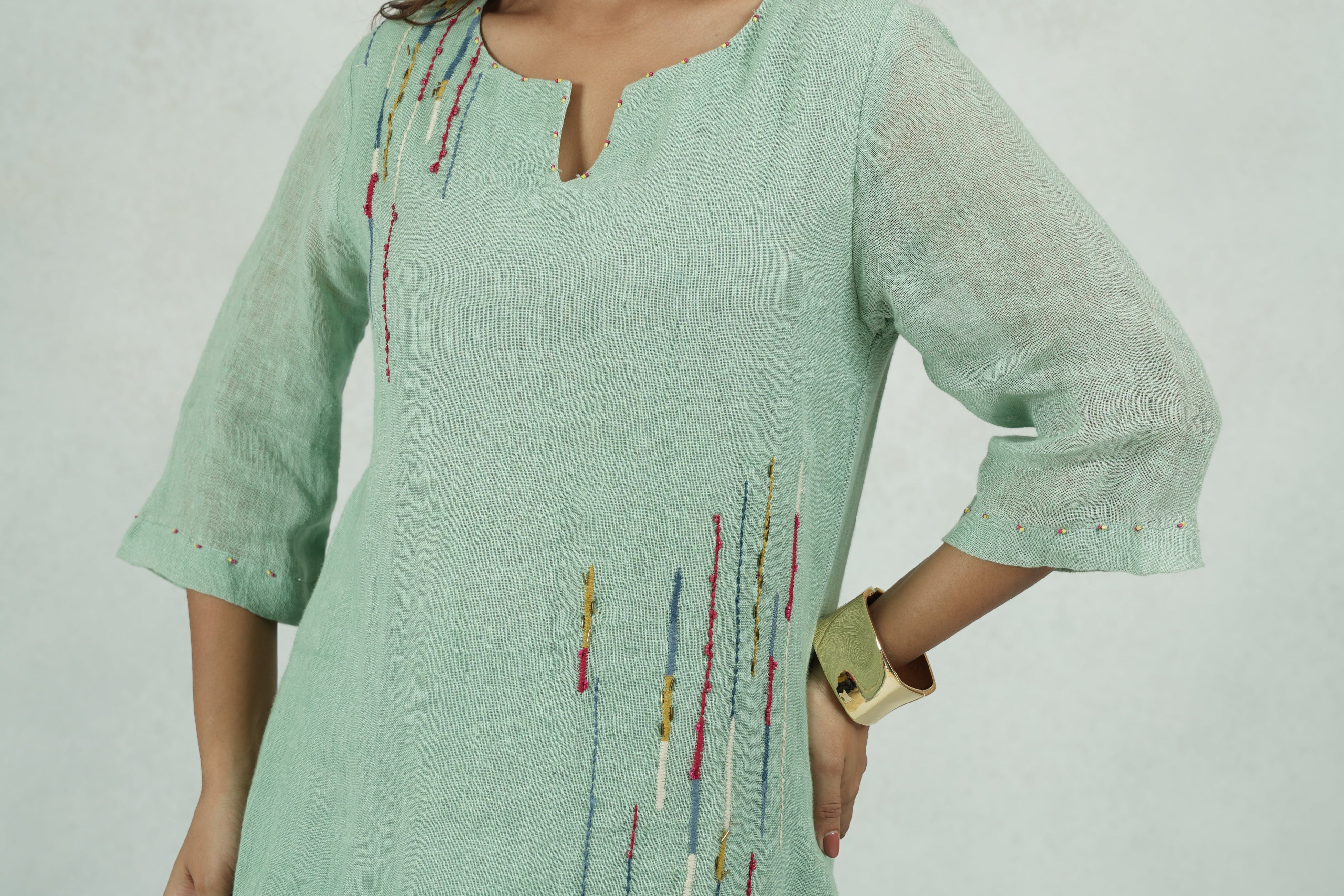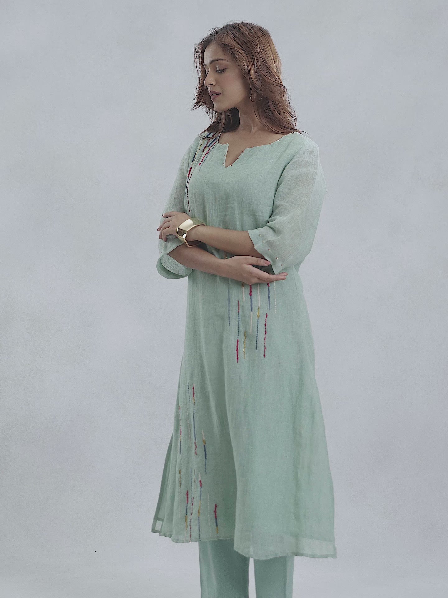 Elevate your everyday with Anjali. A breezy, mint green kurta set in a luxurious linen blend, detailed with vibrant, multi-color thread work.