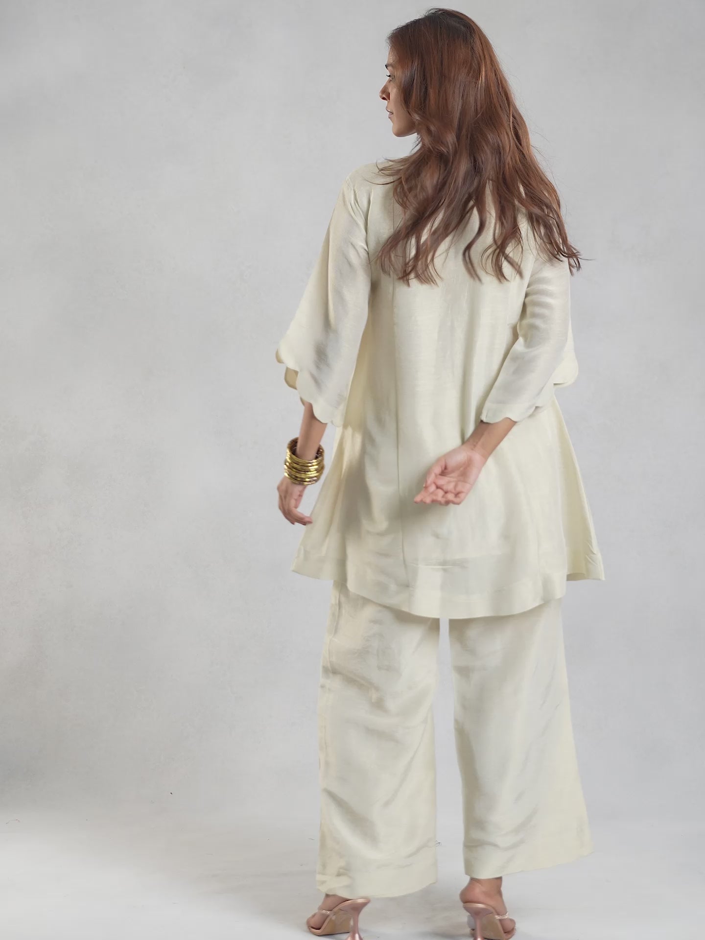 Discover serene elegance with Asmita. A sophisticated off-white co-ord set in a soft linen-tissue blend, designed for a relaxed yet polished silhouette that's perfect for any occasion.