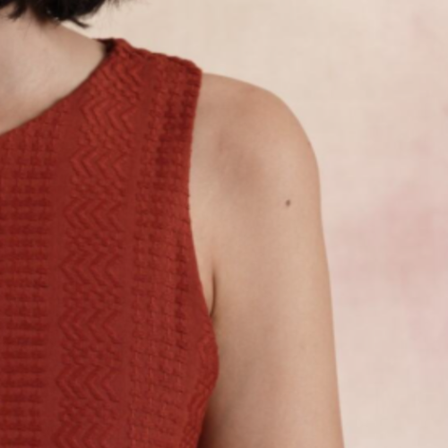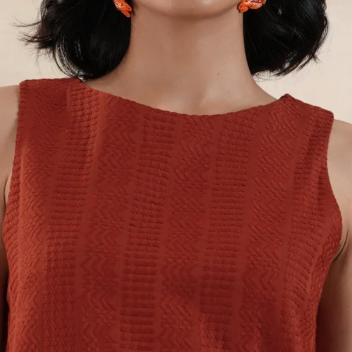 A vivid, self embroidered sleeveless dress with intricate textures.
