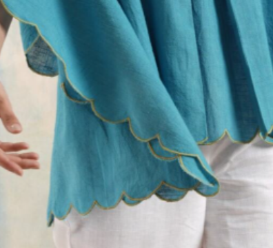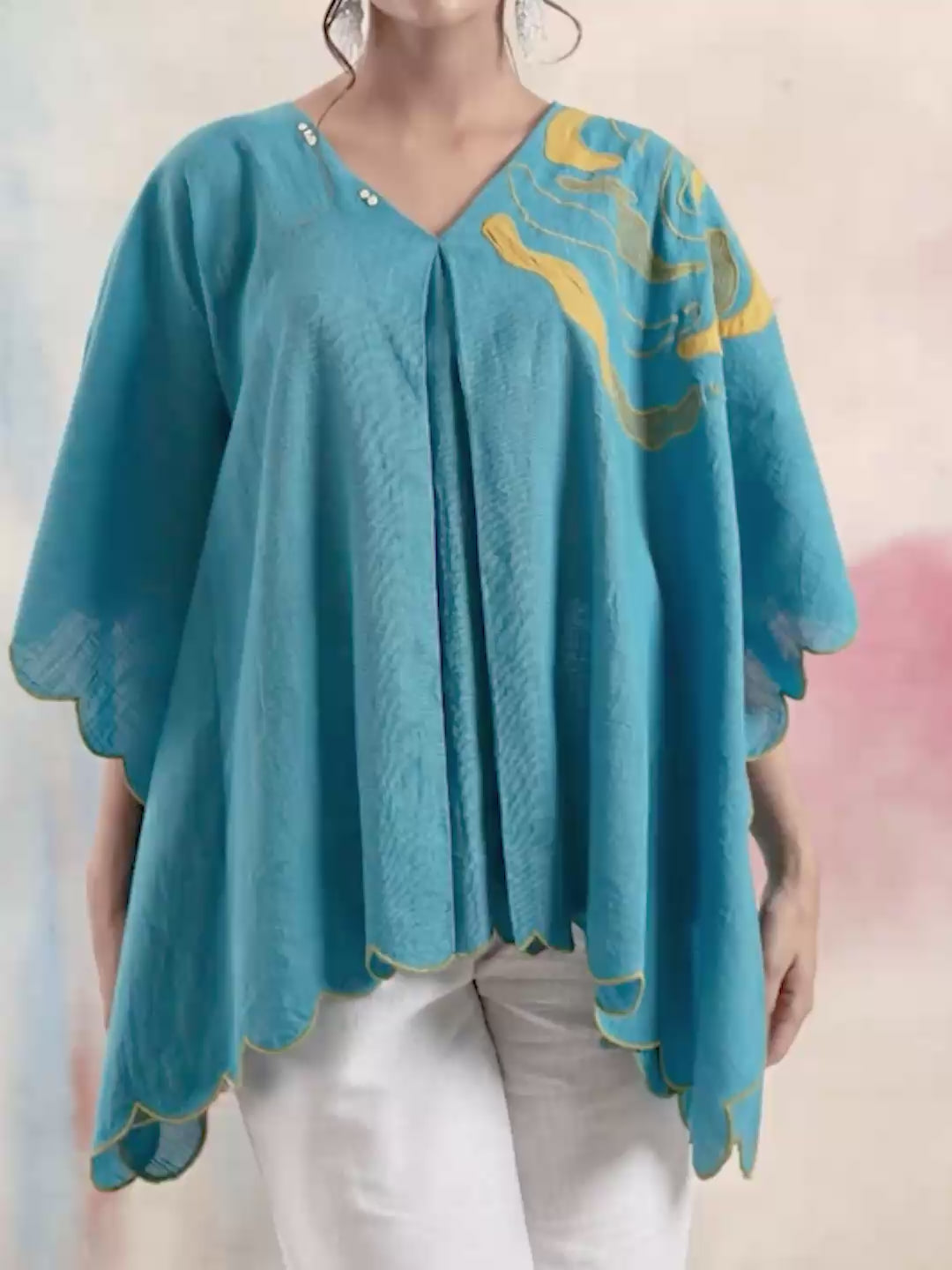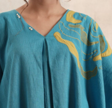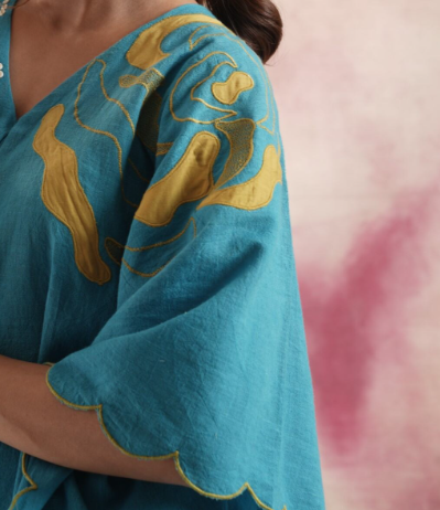 A turquoise pure cotton kaftan with appliqué work and an asymmetric hemline.
