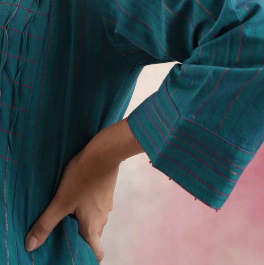 A pure mangalgiri kurta set with ruching and hand bead work.