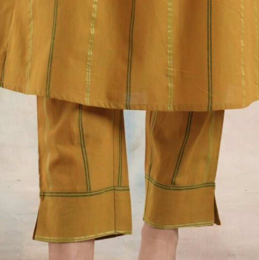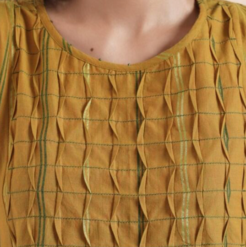 A pure mangalgiri kurta set with ruching and hand bead work.
