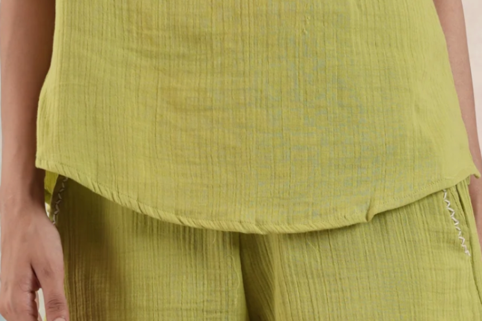 A lime-hued sleeveless cotton top with embroidery and fringe patch detailing.