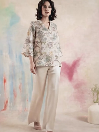 A breathable linen-blend top with beautiful floral prints and a mandarin neck.