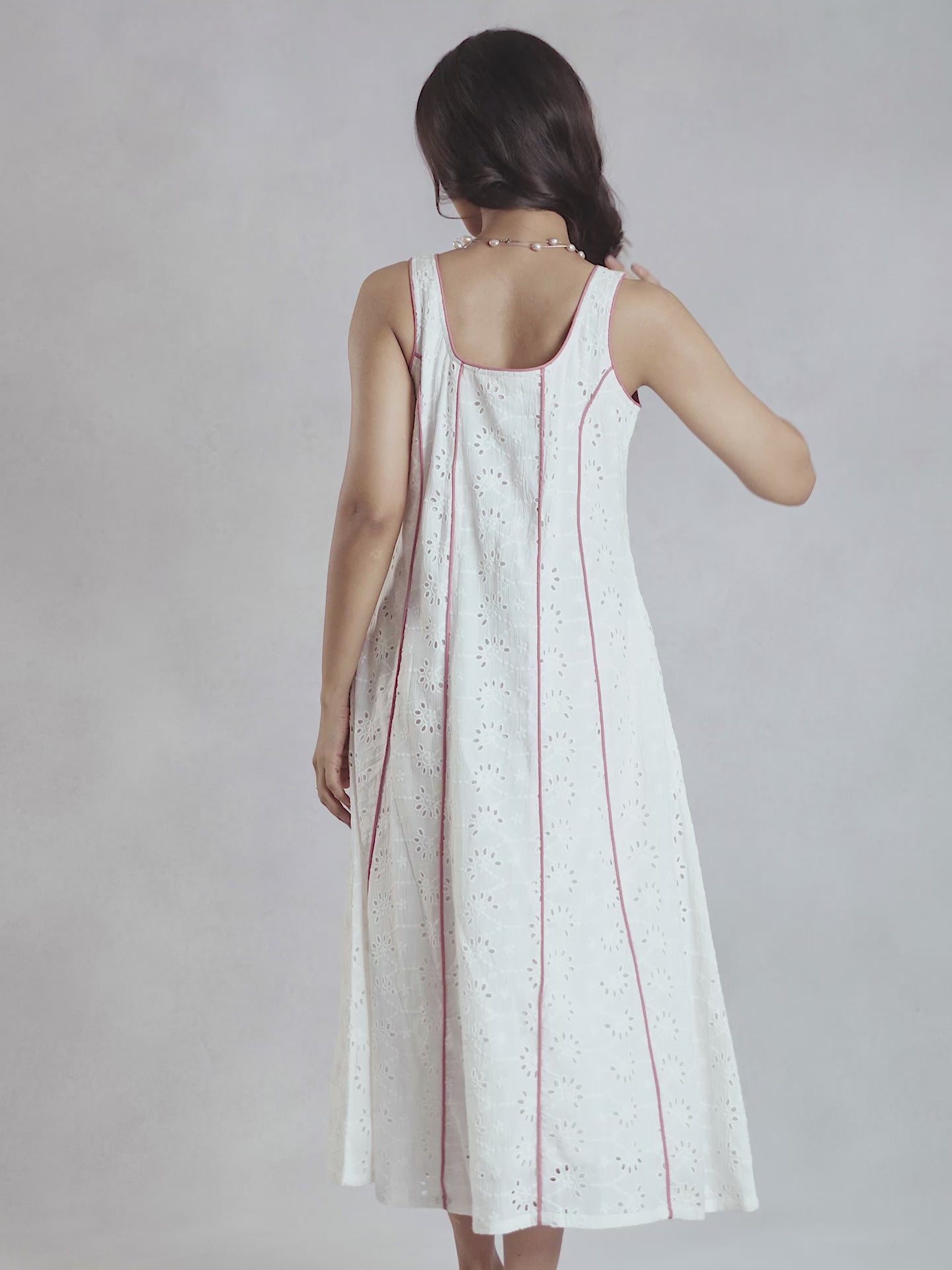A charming sleeveless white Schiffli dress featuring a flowing A-line silhouette and delicate pink contrast piping.